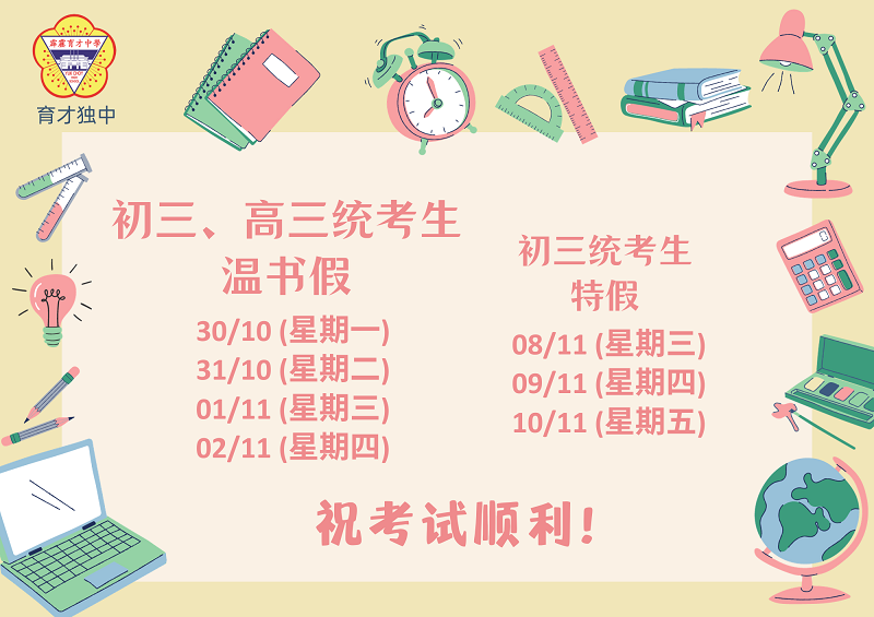 年 终 大 考 时 间 表 日期:06.11.2023(星期一)~ 10.11.2023(星期五) 点击图片可浏览和下载考试时间表。