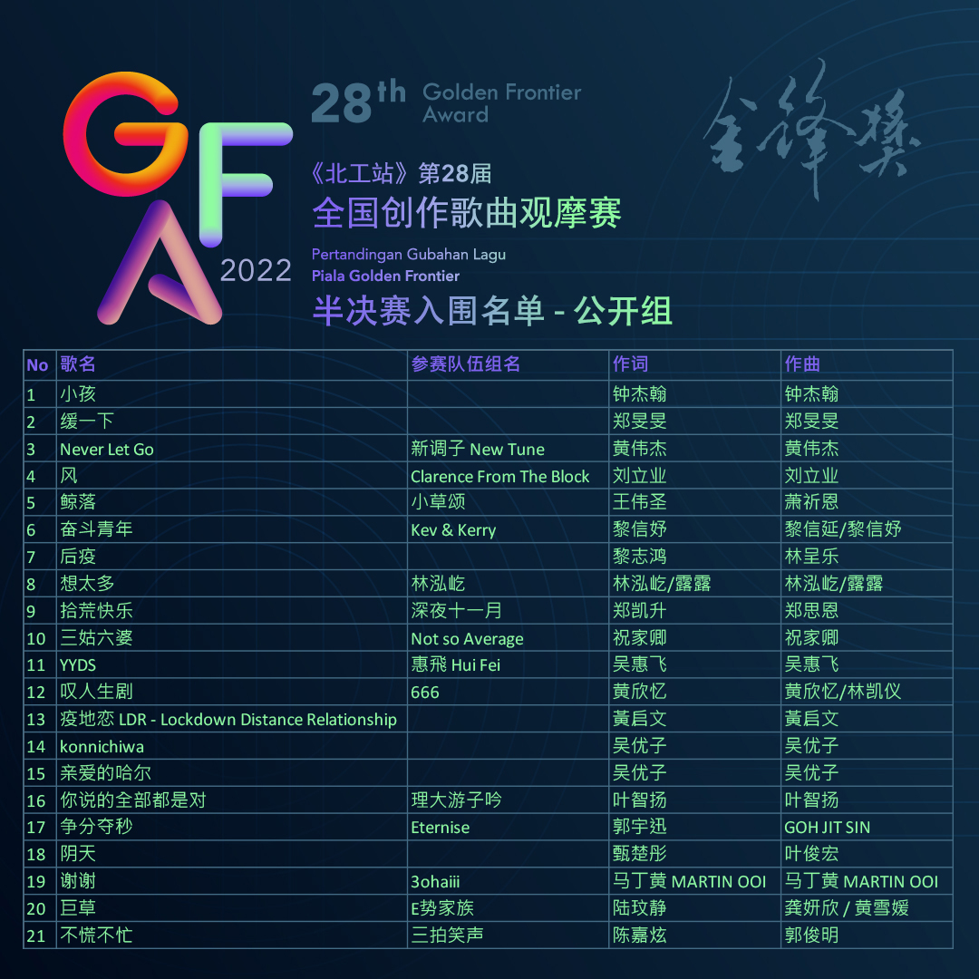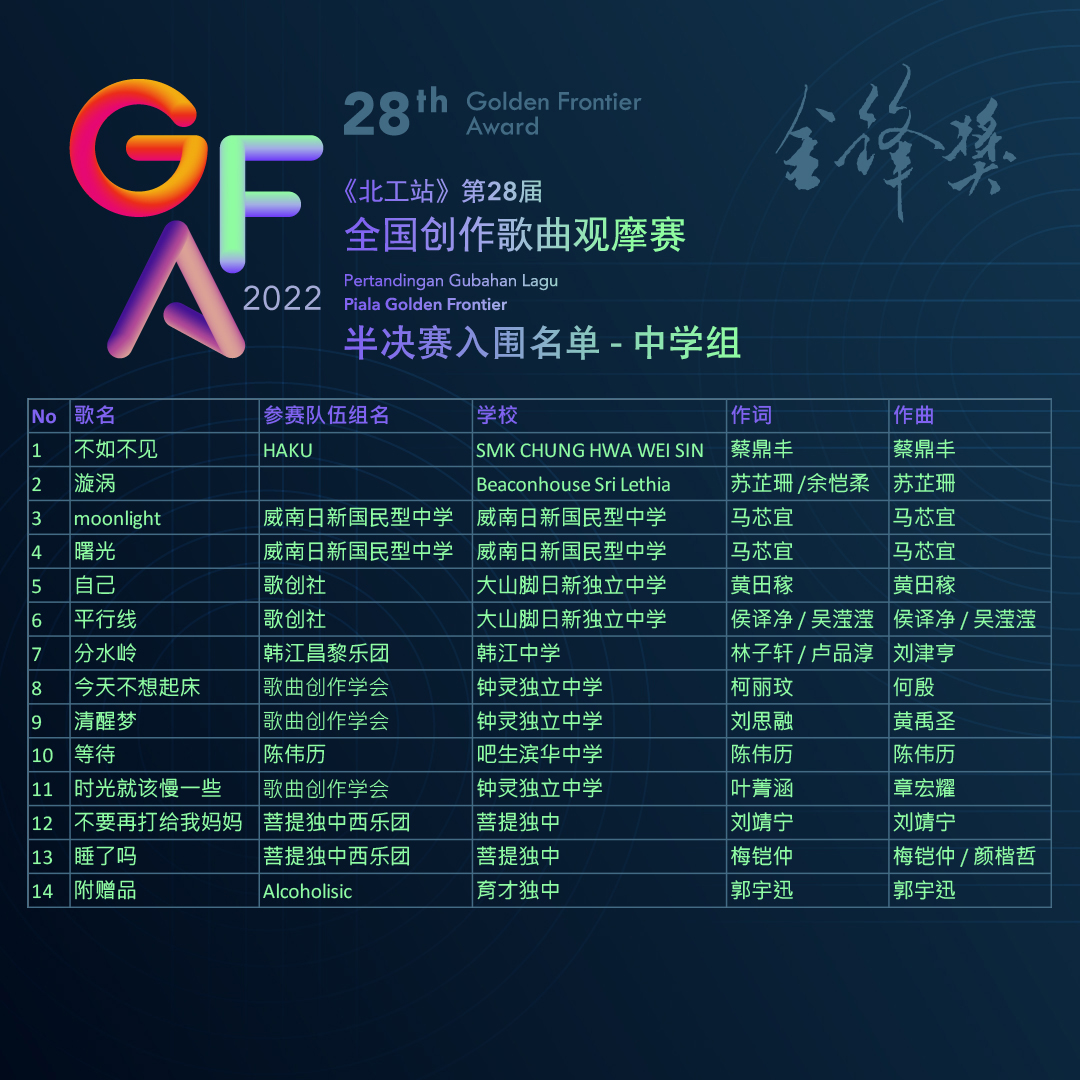 恭喜郭宇迅同学的两首作品分别入围《北工站》第28届“金锋奖”全国创作歌曲观摩赛的中学组和公开组半决赛! 《附赠品》(作曲、作词): 入围 中学组半决赛 《争分夺秒》(作词):入围 公开组半决赛 半决赛将于9月25日在 Penang Komtar Auditorium 举行。 https://www.facebook.com/1734812603215082/posts/pfbid0GgdSLcndyv9PwKBV6tTAECYeeyrpXvrkmNWZ5BrzEtn3UfY9dtgkcU5LyUrhbGHUl