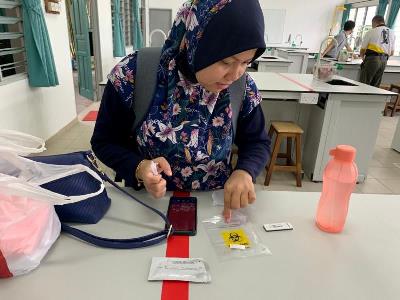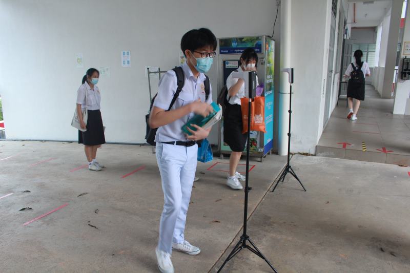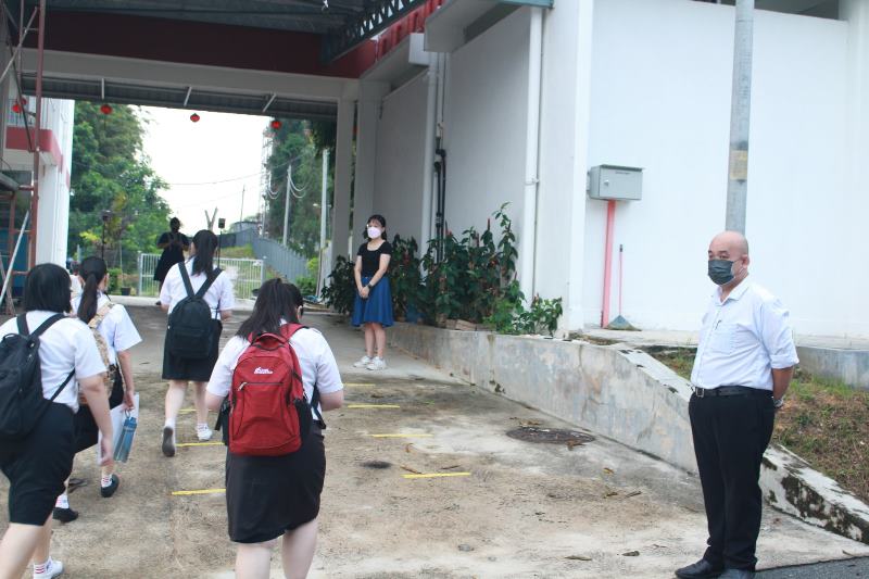 本校高三学生今日复课,为了确保校园的防疫安全,让家长放心,校方除了严格遵守学校复课标准作业程序,也于今早派发冠病快筛试剂盒予教职员自行检测,降低校园的冠病入侵风险。 黎镇光校长和行政老师们今日一早便守在指定的校园入口处,引导学生测量体温、整理仪容后再进入校园。本校复课前已做好准备工作,整顿校园,进行消毒工作,以保持卫生整洁。