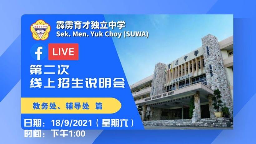 【2021年9月18日】脸书直播:招收2022学年新生线上第二次说明会 (教务处、辅导处篇) 10月30日办线上新生入学考试 本校将于2021年9月18日(星期六)下午1时,举行由教务处及辅导处负责讲解的“招收2022学年新生线上第二次说明会”,欢迎小六生与家长前来本校官方脸书一同参与。 育才独中脸书:www.facebook.com/YuCaiDuZhong