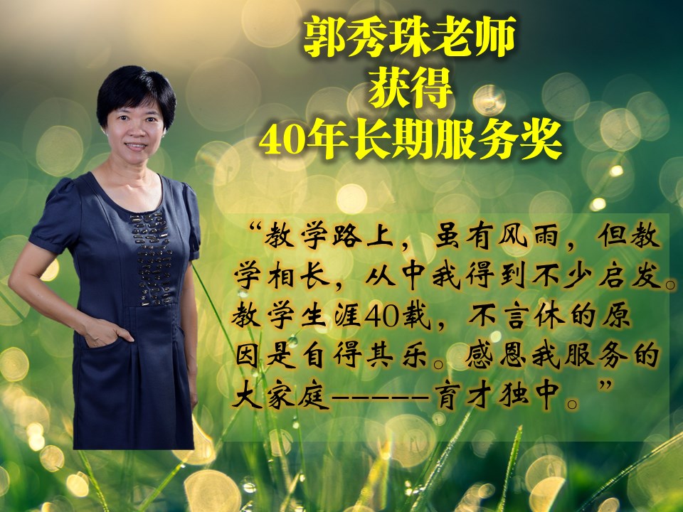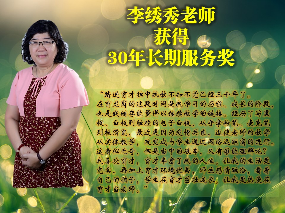 2021年育才独中教职员长期服务奖 恭喜本年度获得“长期服务奖”的教职员,您们的辛劳付出和栽培,让育才的种子们在育龙岗上茁壮成长。 服务 40 年:郭秀珠老师 服务 30 年:李绣秀老师、周素云老师、李丽珍老师、游志明老师、傅玉清女士 服务 20 年:谢志明老师 服务 10 年:纪瑞芬老师、刘顺辉老师 金马仑校友回馈母校 捐献蔬菜和助学金