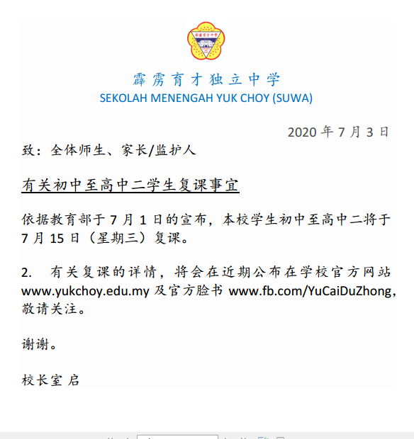 【有关初中至高中二学生复课事宜】