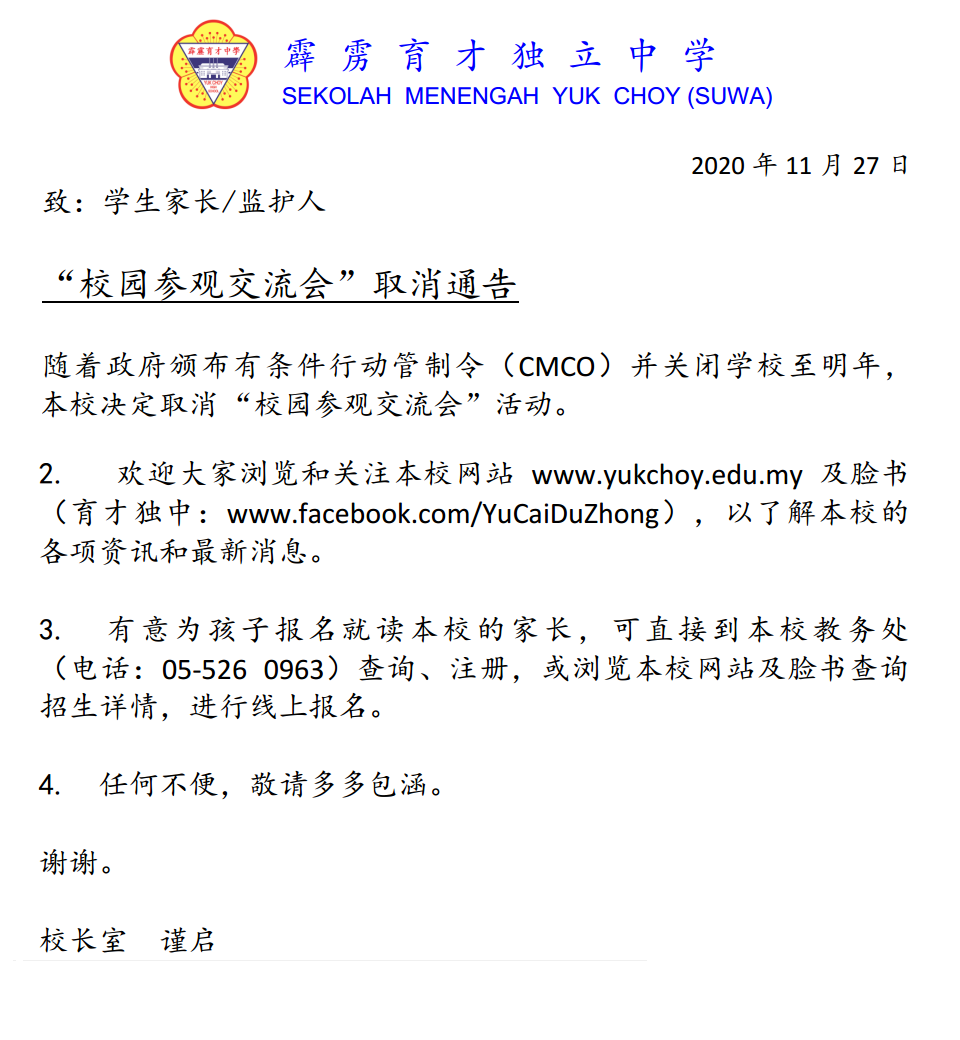 最新 育才新闻【通告】“校园参观交流会” 活动取消