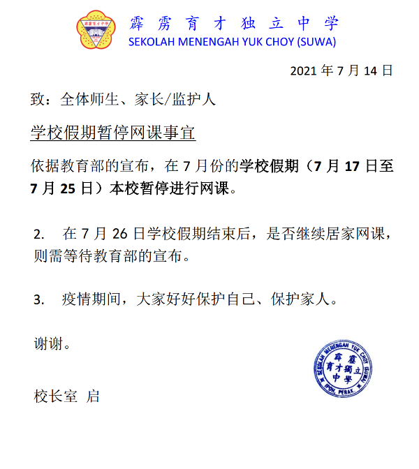 【通告】学校假期暂停网课事宜