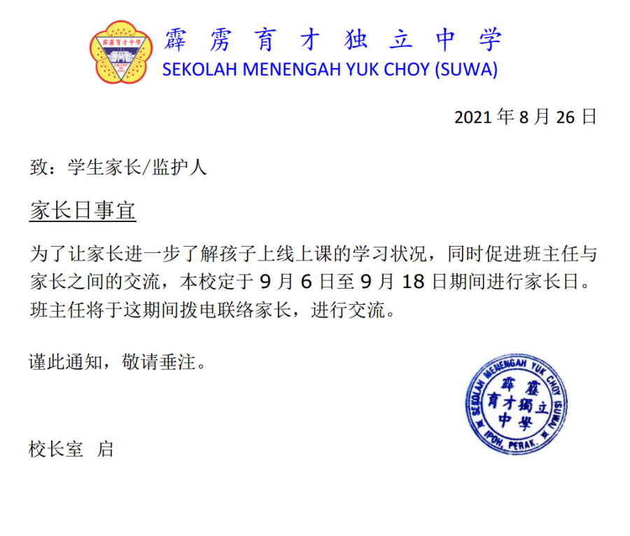 【通告】家长日事宜