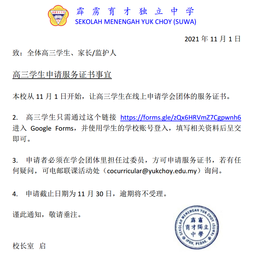 【通告】高三学生申请服务证书事宜 “高三学生只需通过这个链接 https://forms.gle/zQx6HRVmZ7Cgpwnh6 进入Google Forms,并使用学生的学校账号登入,填写相关资料后呈交即可。”