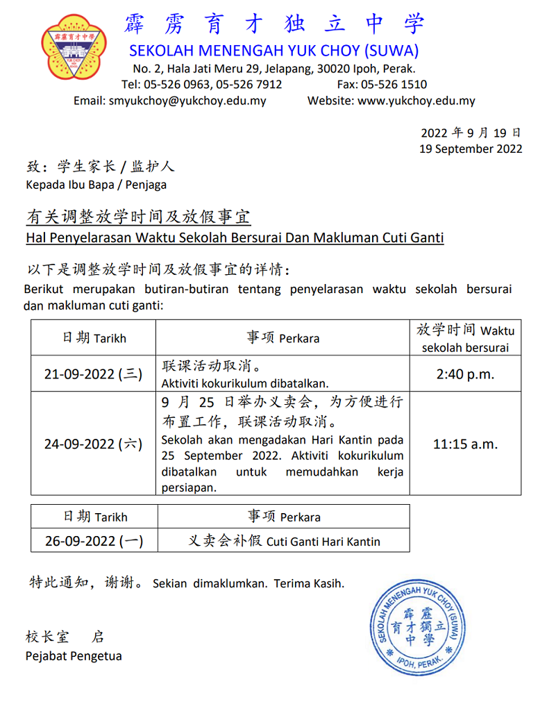 【通告】有关调整放学时间及放假事宜