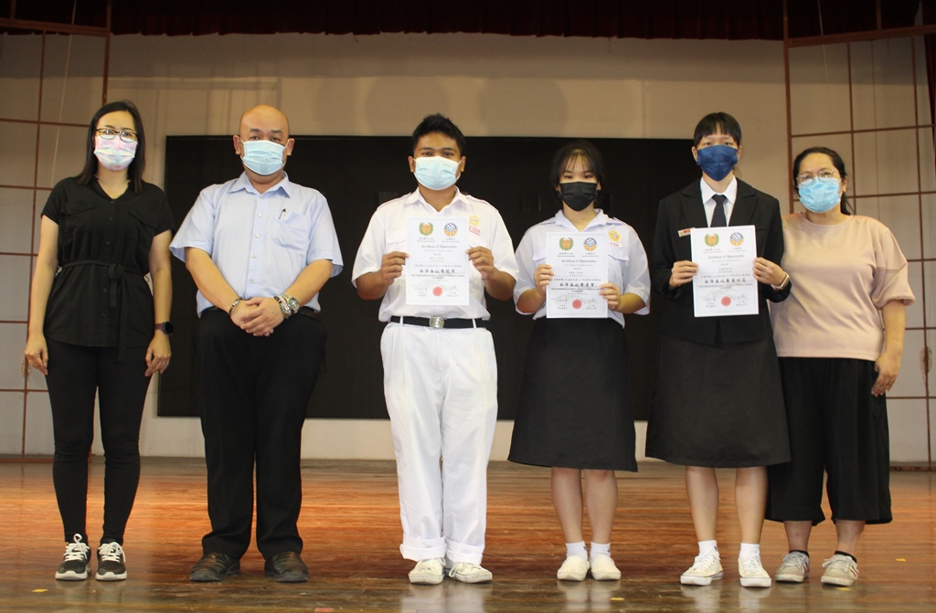 本校黎镇光校长在周会上颁发奖状给获奖学生,美术科主任古景遥老师和高一文美班美术科任叶丝淣老师陪同,一起分享喜悦。
