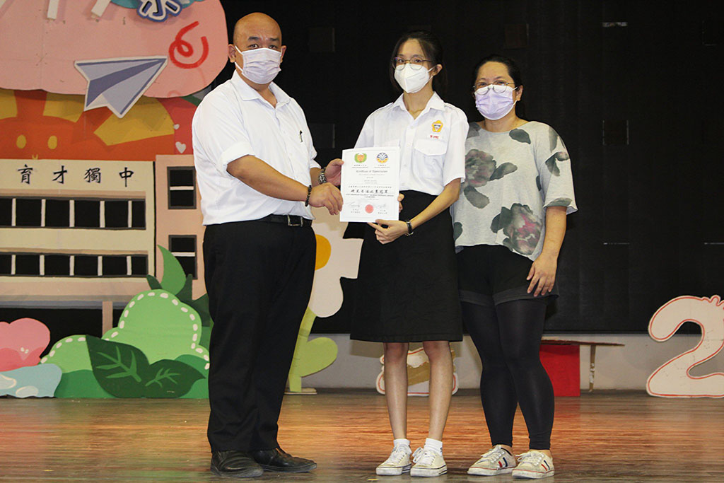 左起黎镇光校长、萧欣柔同学、指导老师古景遥老师。