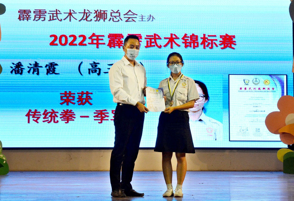 本校高三理学生潘清霞参加霹雳州武术锦标赛,夺得女子组传统拳季军,为校争光。