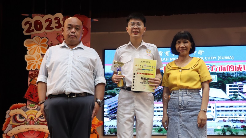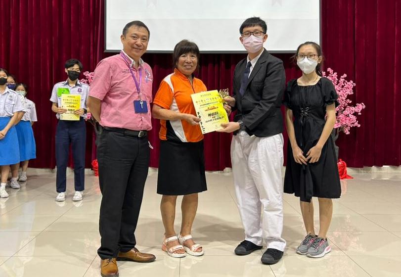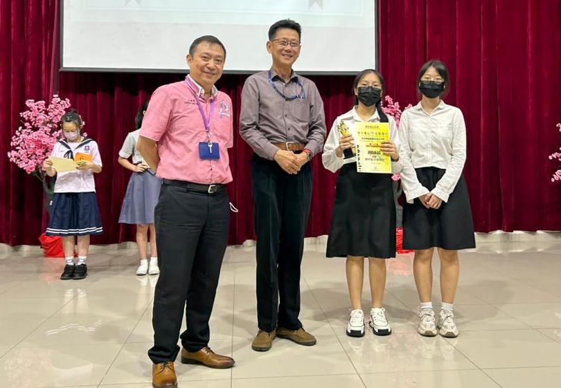 黎镇光校长(左一)于周会上表扬在华语诗歌朗诵比赛获奖的杨曲星,右一是负责老师胡丽珍。