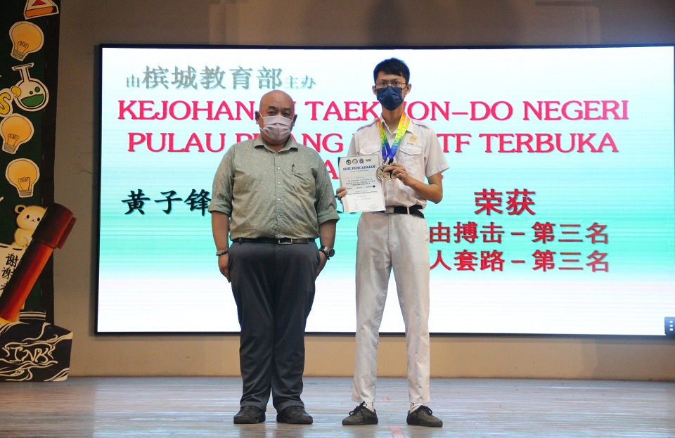 高一文美的黄子锋同学日前参加第二届槟城跆拳道公开赛[Kejohanan Taekwon-do Negeri Pulau Pinang (ITF-MTF) Terbuka Kali ke-2],荣获自由搏击和个人套路第三名。