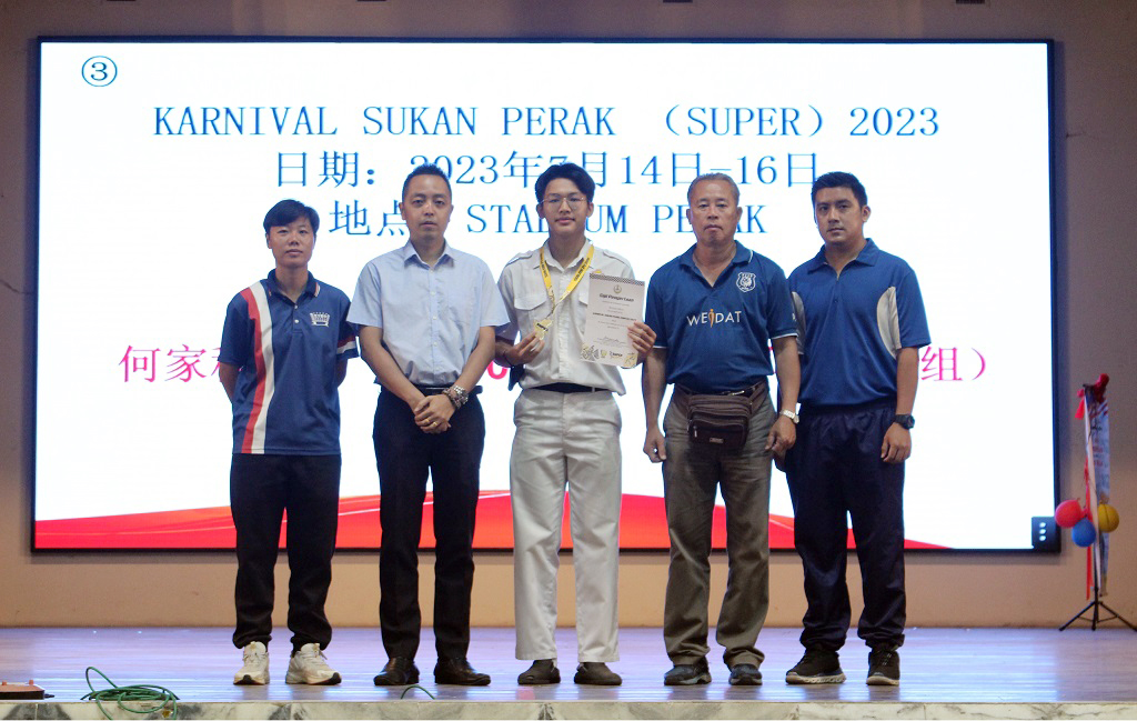 本校高三文美班的何家程同学参加了Karnival Sukan Perak(SUPER)2023 的比赛,成功获得男子组4×100米冠军,这是一项县对县的霹雳州级赛事。他感谢父母的支持,教练的指导,还有身边的朋友和队友的支持。他在日前的周会上从朱荣熙副校长手中领取奖牌和奖状,体育处主任王英健老师、体育处助理锺微丝老师和蒙光程老师陪同见证,与全校师生分享喜悦。