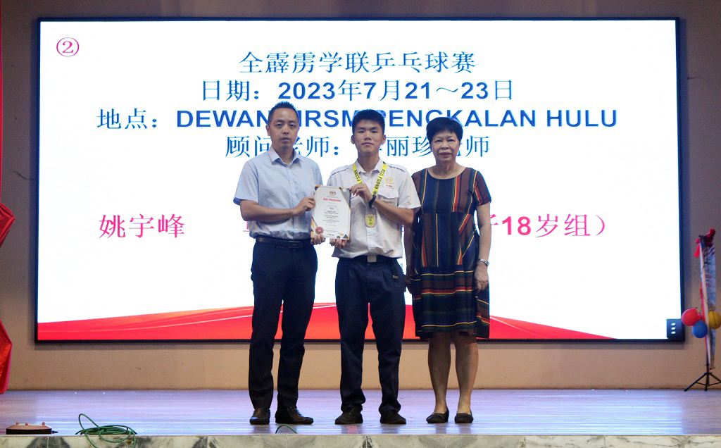 高三汽修班的姚宇峰同学日前参加2023年全霹雳学联乒乓锦标赛 (Kejohanan Ping Pong MSS Perak 2023),在18岁以下男子组单打比赛中,成功夺得季军。他在日前的周会上从朱荣熙副校长手中领取奖牌和奖状,顾问李丽珍老师陪同见证,与全校师生分享喜悦。