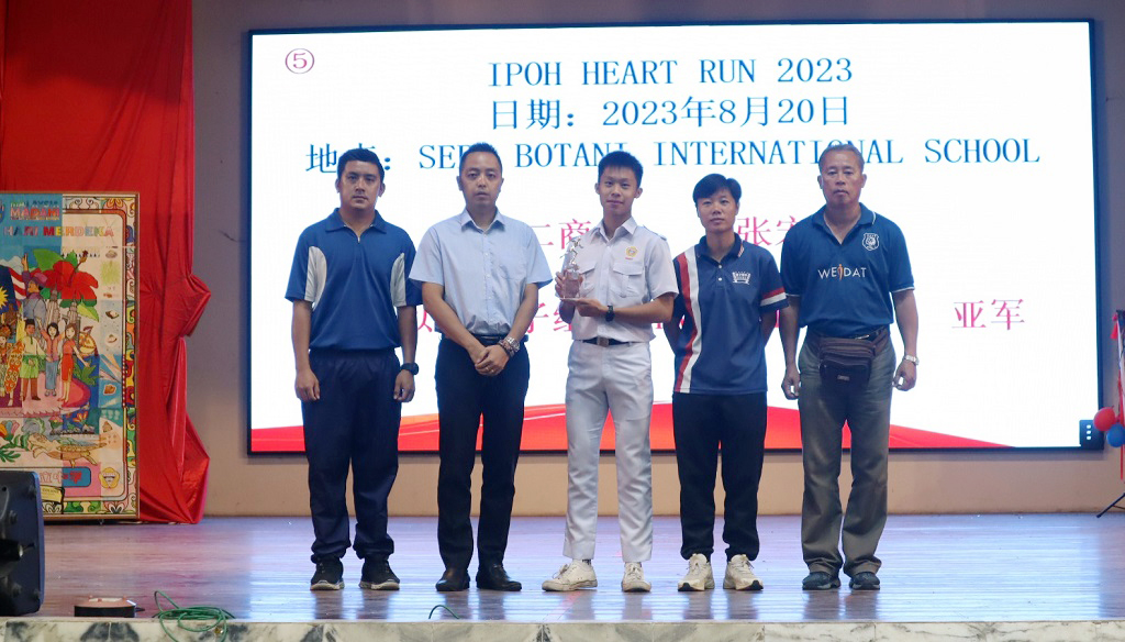 本校高二商1班的张宏毓同学日前前往Seri Botani国际学校,参加了“Ipoh Heart Run 2023”,并夺得18岁以下男子组亚军。他在周会上从朱荣熙副校长手中领取奖杯,体育处主任王英健老师、体育处助理锺微丝老师和蒙光程老师陪同见证,与全校师生分享喜悦。
