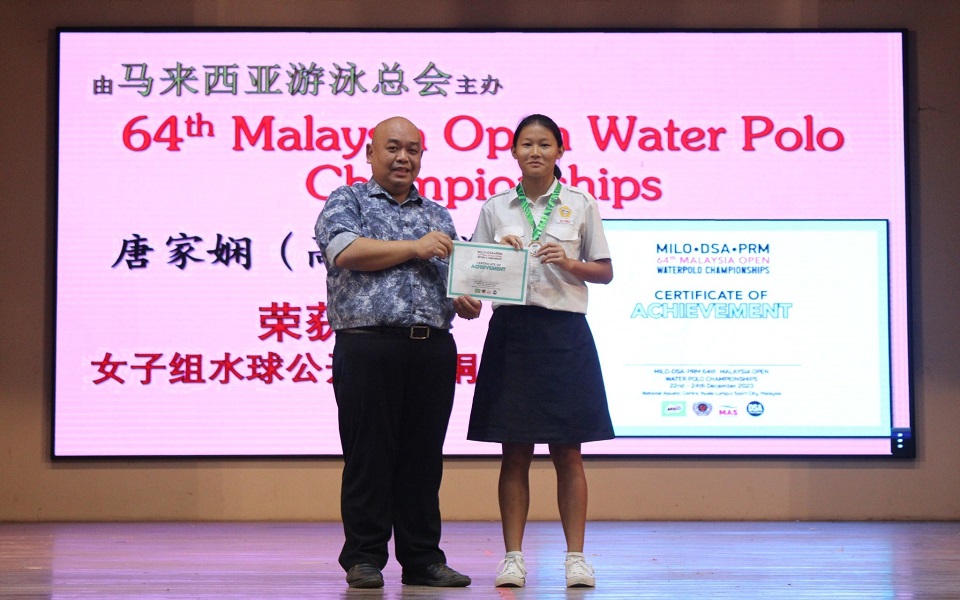 本校唐家娴(高二文美)日前参加 MILO-DSA-PRM 64th Malaysia Open Water Polo Championships 第64届马来西亚水球公开赛,荣获女子组铜牌,为本校和霹雳州争光。