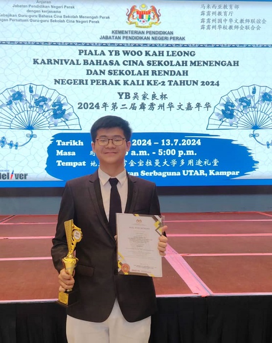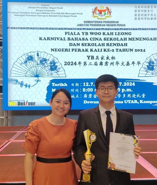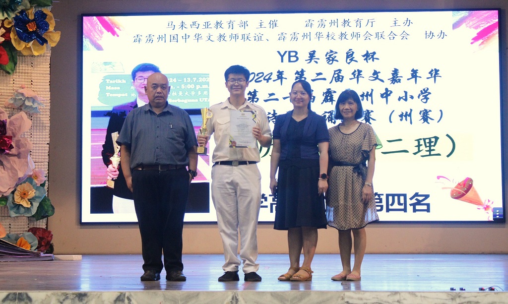 YB吴家良杯2024年第二届霹雳州华文嘉年华 第二十届霹雳州中小学华语诗歌朗诵比赛 主催:教育部 主办:霹雳州教育厅 协办:霹雳州国中华文教师联谊会、霹雳州华校教师会联合会 陈历旗(高二理):高中组 第4名 黎镇光校长在周会上表扬陈同学并感谢陈丽华老师的指导,教务主任胡丽珍老师也一同上台分享得奖喜悦。 |