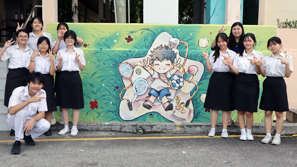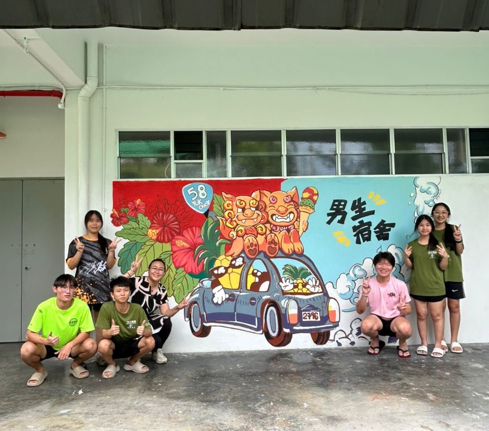 为了让宿舍环境更具活力、更富色彩,在舍务主任 陈世文建议,文美班的美术科任叶丝淣老师鼎力指导下,寄宿生在男生宿舍完成彩绘壁画! 六位寄宿生用了两天的时间,为男生宿舍旁原本素白的墙面,摇身一变成为色彩缤纷、生机满满的艺术墙,让宿舍瞬间亮了起来。 参与壁画创作的同学包括: 高一文美班:马萱恩、邓滢滢、黄富康 高二文美班:李佩恩、郭苠亿 初三爱:李峻贤 本校正招收2026年文美班新生,有意报名或欲知更多详情可联络本校教务处,电话号码 05 – 526 0963 或 05 – 526 7912,WhatsApp号码 011‑2058 2172(仅限信息)。