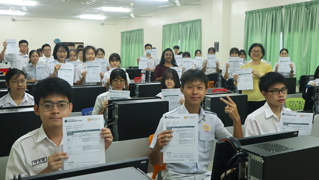 2)第12届新加坡毛笔与硬笔书法大赛(新加坡书法家协会主办):硬笔组 优秀奖 3)2024年全槟书法比赛(国际书法联盟及国际嘎档巴主办):中学组 亚军 4)第五届“中华翰墨情”佛港澳台侨中小学生书法比赛(汉荣书局有限公司主办):中学组 特优奖 庄同学表示非常高兴能够获奖,感谢各个平台举办许多书法比赛,让书法爱好者有机会切磋技艺。他将继续努力,珍惜每一次的参赛机会。 黎镇光校长在周会上代颁发比赛奖状和奖杯给庄同学,并且赞扬他勤力苦练,积极参赛的精神,鼓励大家向其看齐;美术科主任古景遥老师和蔡秀芳老师也一起上台陪同领奖,分享喜悦。 摄影:李岢妤(初二孝)、许卉珏(高一理) 本校安排学生参与牛津英语分级测试 审核及加强学生英文掌握能力