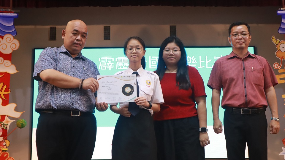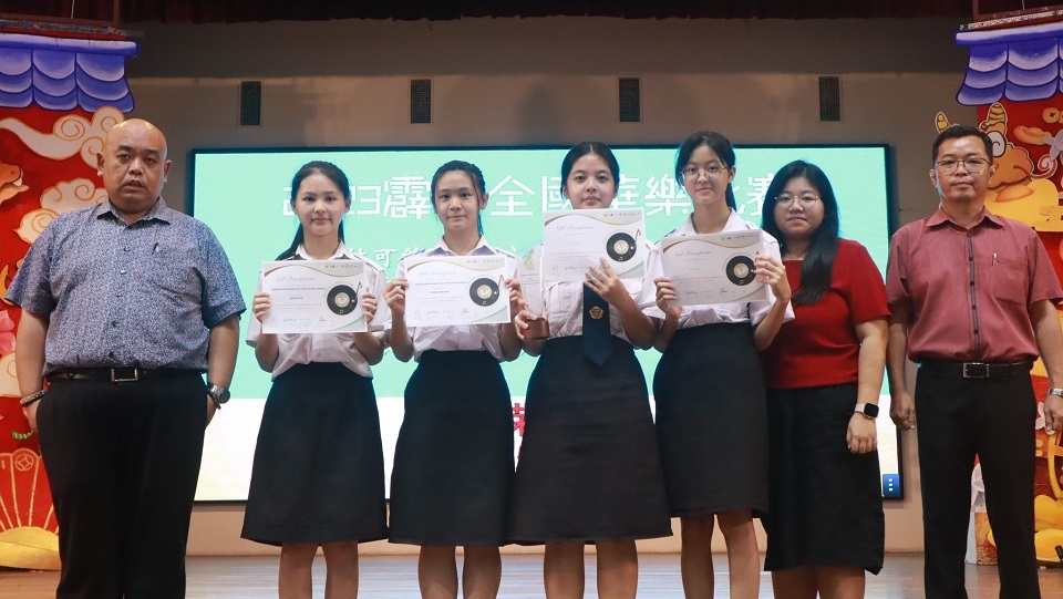 本校华乐团参加2023霹雳全国华乐节华乐比赛获得佳绩 本校华乐团于日前参与由霹雳怡保青年华乐文化协会主办、万里望文化协会协办的“2023霹雳全国华乐节“,并在“2023霹雳全国华乐比赛”中的敲击乐和二胡重奏两个项目,分别荣获金奖和银奖。 演奏敲击乐并荣获金奖的团员是林可绚(高三商1)、岑文越(高一商1)、叶恵心(高一商2)、王依欢(初三仁)以及三名2023年毕业校友林昱諠、赖正韬、莫梓煌,他们凭藉一首《龙腾虎跃》脱颖而出。演奏二胡重奏的团员是覃淼丽(高三文美)、周海瞳(高二商1)、陆欣铃(高二文美)、柯思萃(高一商2)、邝依彣(初三爱)、梁景森(初三信)和林楷翔(初一信),他们凭藉一首《八月桂花遍地开》荣获银奖。 此外,其他华乐团团员也分别在声部合奏、柳琴齐奏、笛子齐奏、大提琴重奏、中音笙重奏、高音笙重奏均荣获铜奖。华乐团团员是在领队老师苏民胜老师和郭欣彤老师的带领下前往参赛。 黎镇光校长于日前在周会上移交奖状并恭喜获奖的华乐团团员,也代表校方感谢团员们的努力付出和教练郭欣怡小姐的指导。 黎校长表示,华乐是中华传统文化代表性艺术之一,团员在勤练演奏技艺的同时,也要提高自身的华乐知识和赏析能力,丰富自己的艺术修养与内涵,那么演奏才能感动聆听者,并且取得更高的艺术造诣,有效的传承华乐这项中华艺术。 此次参赛的华乐团主席周海瞳同学分享道,在赛场上可以观察到其他参赛华乐团体,不管是奏乐时的音准准确度、观赏性、整齐一致的程度、台风等方面都发挥出很高的水平。因此,没想到本校华乐团能够取得不俗的成绩,接下来希望能够与团员们再接再厉,努力的锻炼和磨合,演奏更多动人的曲子。 2024年《精武杯》青少年足球赛:殿军