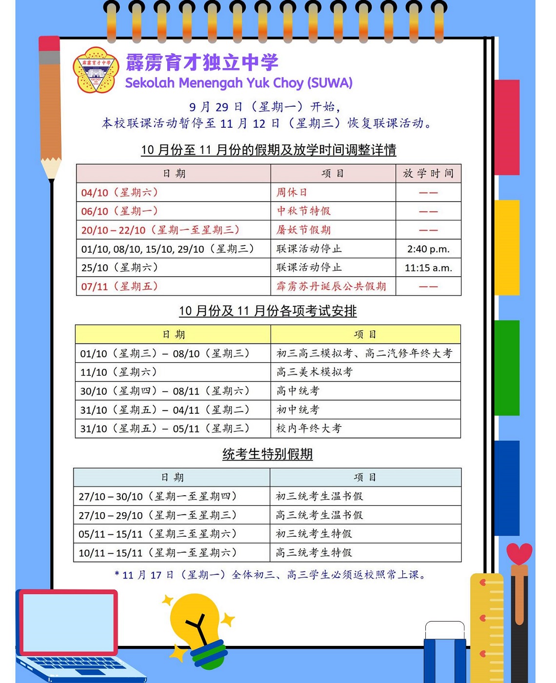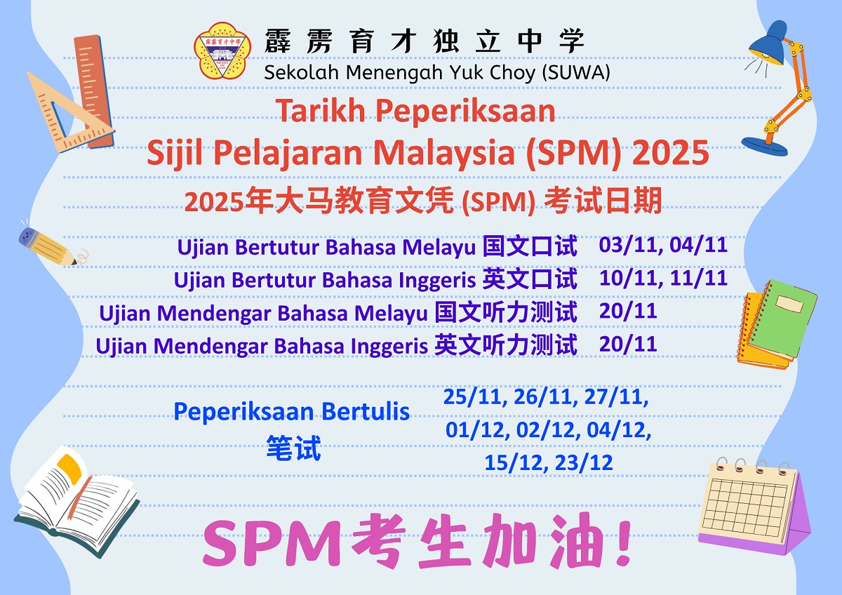年 终 大 考 时 间 表 日期:31.10.2025(星期五)~ 05.11.2025(星期三) 点击图片可浏览和下载考试时间表。