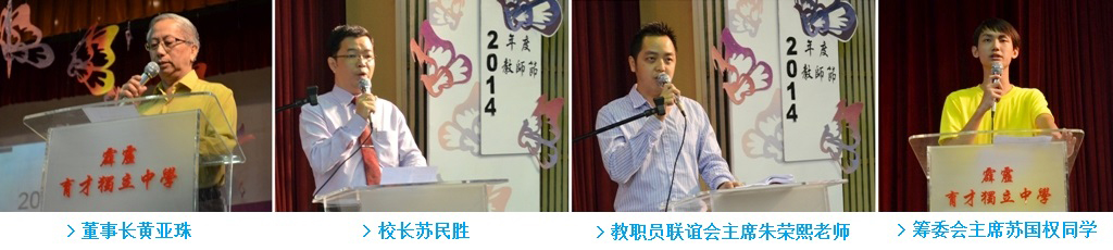 本校董事长黄亚珠在致词时说,同学们为了筹备教师节,尽心布置舞台,排练表演节目,希望把最好的才艺呈献给老师,这种表示尊敬老师的行为,是令人非常感动的。他说,老师的主要职责是教书育人,传授学生知识和教导学生做人的道理,把学生培育成有知识、有纪律、有思想、有理想和有高尚品德的人。他说,学生对老师最好的报答和感恩,就是读好书,做好功课,在社会做一个有用的人,当未来在社会大有作为的时候,就是送给母校老师最贴心、最动人心弦的礼物。