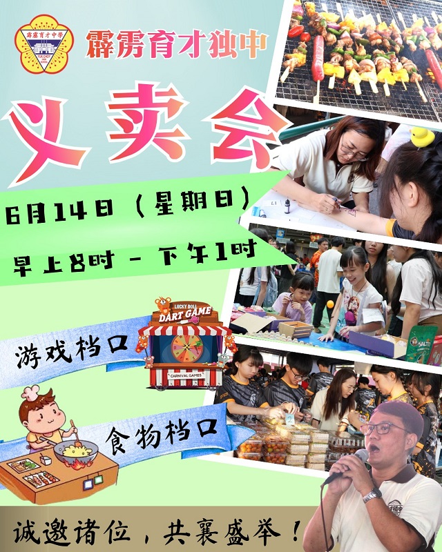 为筹募学校发展基金,本校精心筹办这场充满爱与活力的义卖盛会。届时,全校师生齐心协力,各显身手 — — 以琳琅满目的美食俘获你的味蕾,以丰富有趣的游戏留住你的脚步,势必让你流连忘返、尽兴而归!