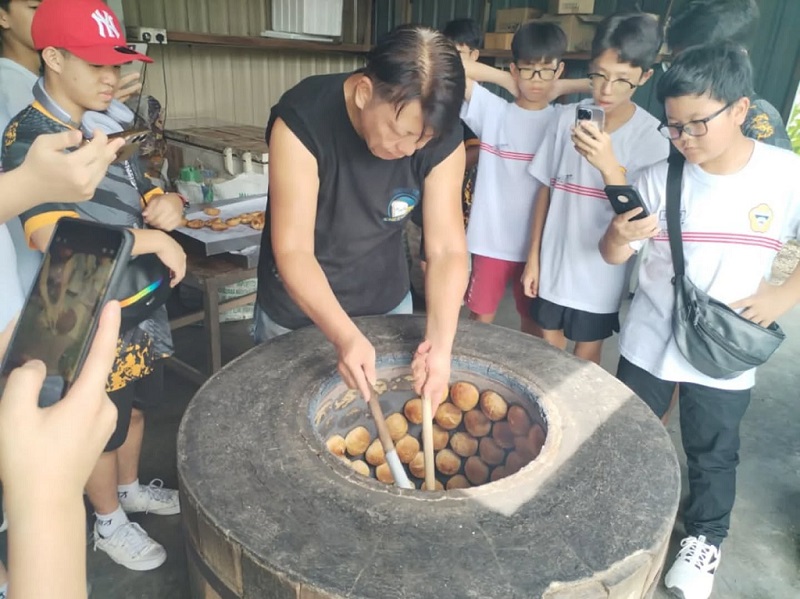 接下来,同学们参访了一家以传统炭窑制作香饼的老字号店铺 — 爱乡椰壳炭烧香饼。还未走近,阵阵香气已扑鼻而来。