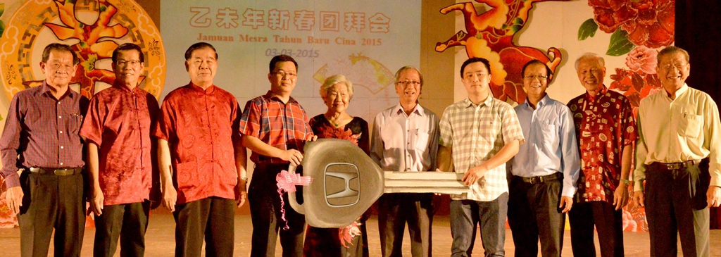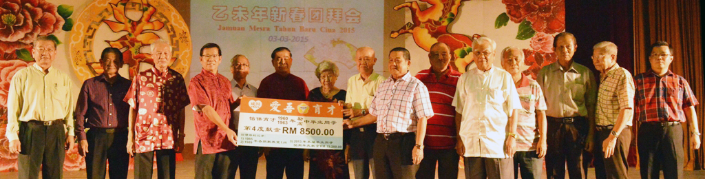 育才独中1960年、1963年初中、高中毕业同学在年初二联欢晚会上为母校筹获8千500令吉,由晚会主席宋国林(右八)和工委会主席袁为和(右七)移交给本校董事会财政刘子真(左四),本校董事会顾问潘斯里李梁琬清(右九起)、董总主席叶新田博士、本校董事长兼新春团拜大会主席黄亚珠和嘉宾们一起见证。左起本校董事会的教育主任王瑞国、新春团拜工委会主席兼本校副董事长覃介邦、署理董事长梁祖肇;右一为本校苏民胜校长。