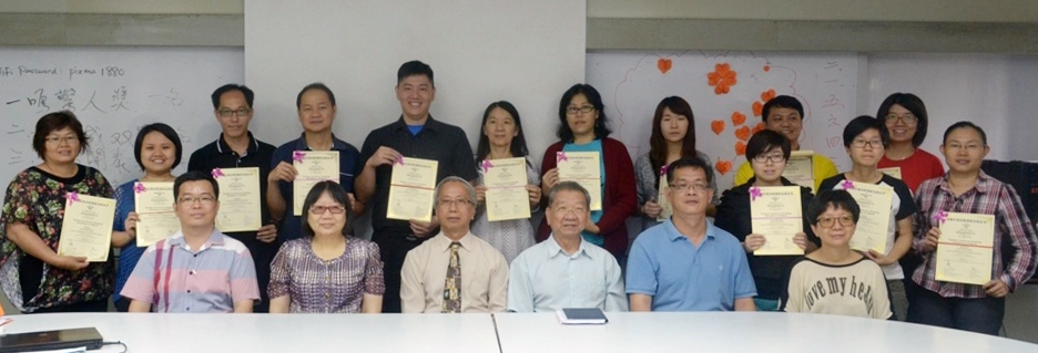 各校代表领取结业证书后与本校苏民胜校长(前排左起)、台湾慈济大学张景媛教授、本校董事长黄亚珠、