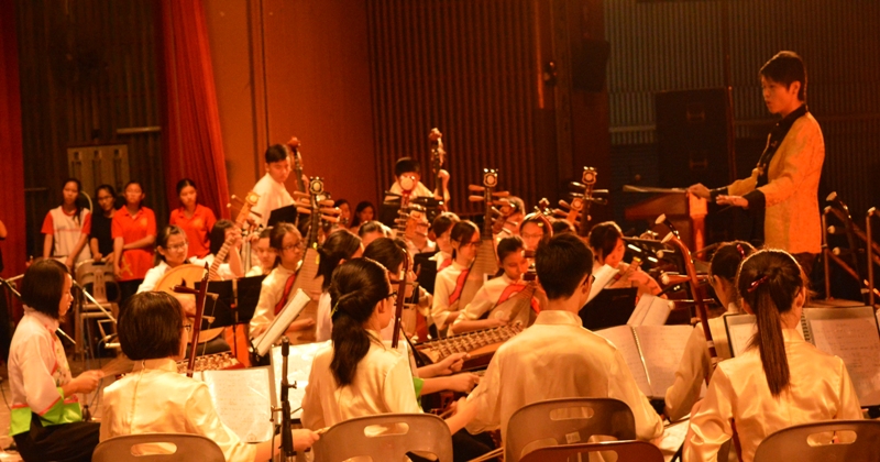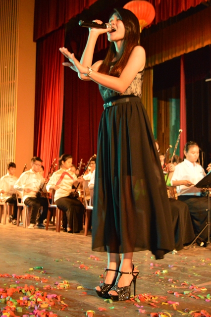 本校陈慧慧同学在华乐团的伴奏下演唱歌曲。