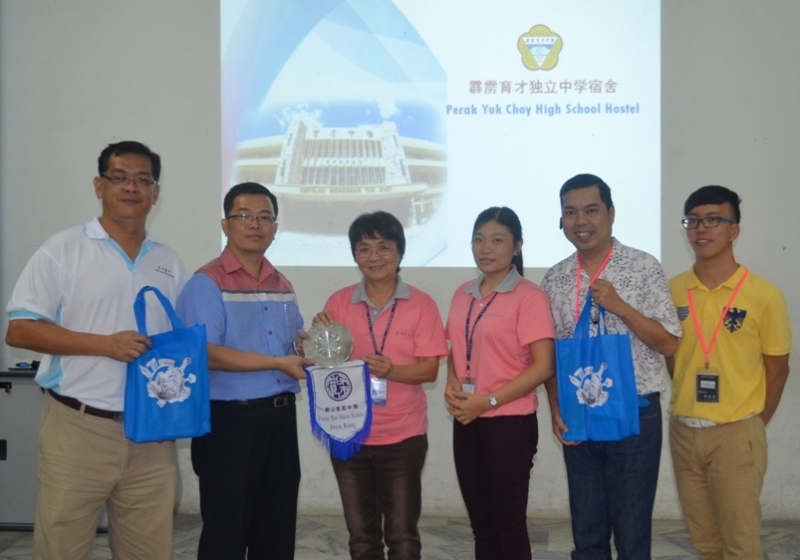 新山宽柔中学副校长陈淑芳(左三)赠送纪念品给本校,由本校苏民胜校长(左二)接领。左一为本校谢志明副校长,右起本校副总舍监黄俊景、总舍监陈世文和新山宽柔中学代总舍监何丽萍。