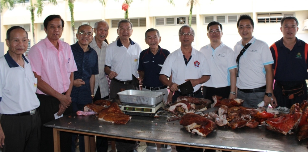 本校董事长黄亚珠(右四)和苏民胜校长(右三)与董事们参观烧肉档。左起董事会副总务蔡建福、副联络主任陈细祥、董事何伟铭、署理董事长梁祖肇、教育主任王瑞国、总务吴章明;右一和二是王英健老师与联课活动处主任朱荣熙老师。