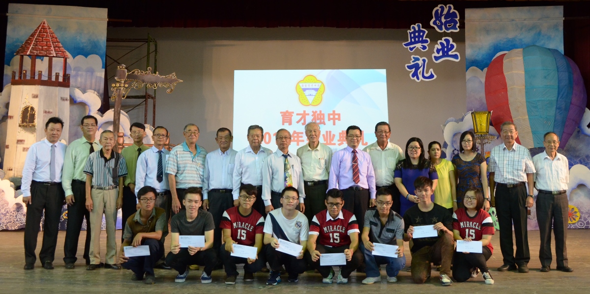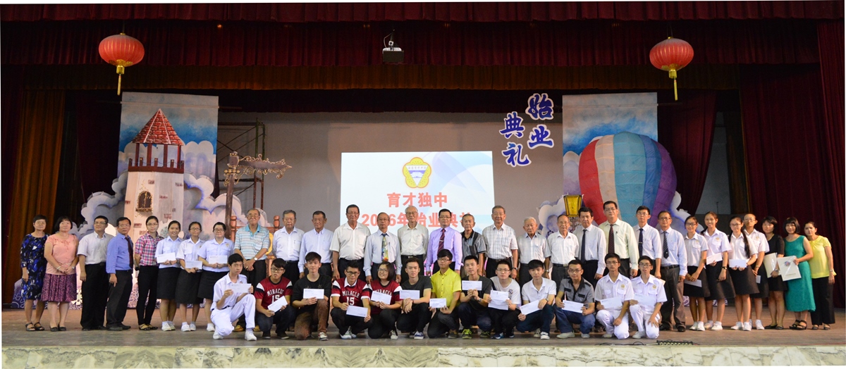 【2015年度统考成绩优异考生(高中)】:左五起黄桂明老师、苏民胜校长、育才校友会理事长拿督吴