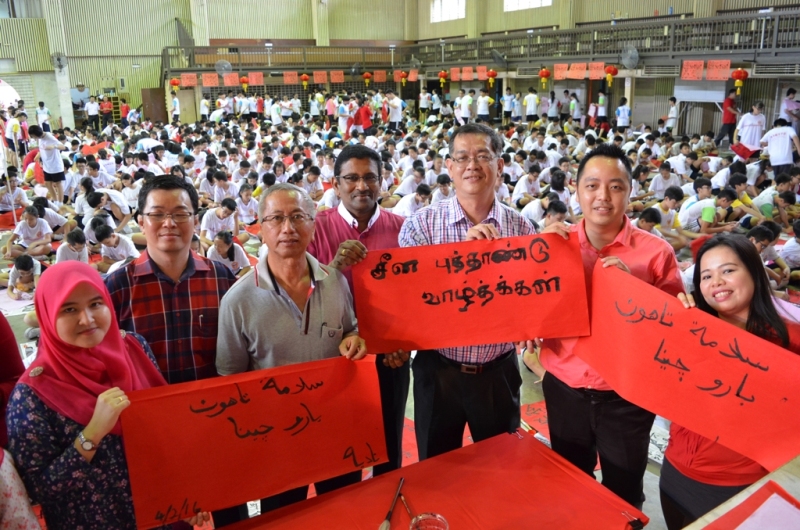 印度老师和马来老师分别以淡米尔文和爪夷文写出“新年快乐”。左起娜迪亚老师、苏民胜校长、黄亚珠董事长、阿索甘老师、谢志明副校长、朱荣熙老师和诺扎老师。