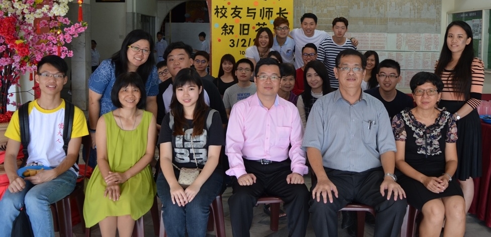 约15名校友出席茶叙会,与昔日的老师叙旧。第一排右起为辅导处主任陈美云、谢志明副校长、苏民胜校长、怡保旅台同学会总干事刘咏乐、华文科主任胡丽珍和旅台校友杨一林。