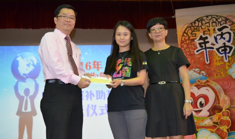 升学情报工作室代表林纾妃(中)移交5000令吉支票给苏民胜校长(左),右为辅导处主任陈美云。