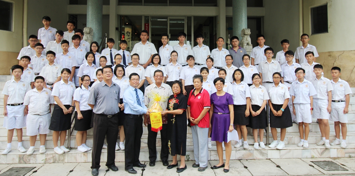 苏民胜校长(前排左二)赠送纪念品和锦旗给郑桂珠(前排右三),前排左一为谢志明副校长,左三副董事长拿督吴国芳,右一及右二为辅导处主任陈美云和校友朱梅丽。