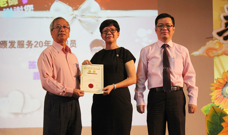 董事长黄亚珠(左)颁发教师长期服务奖给服务超过20年的陈美云(中),右为苏民胜校长。
