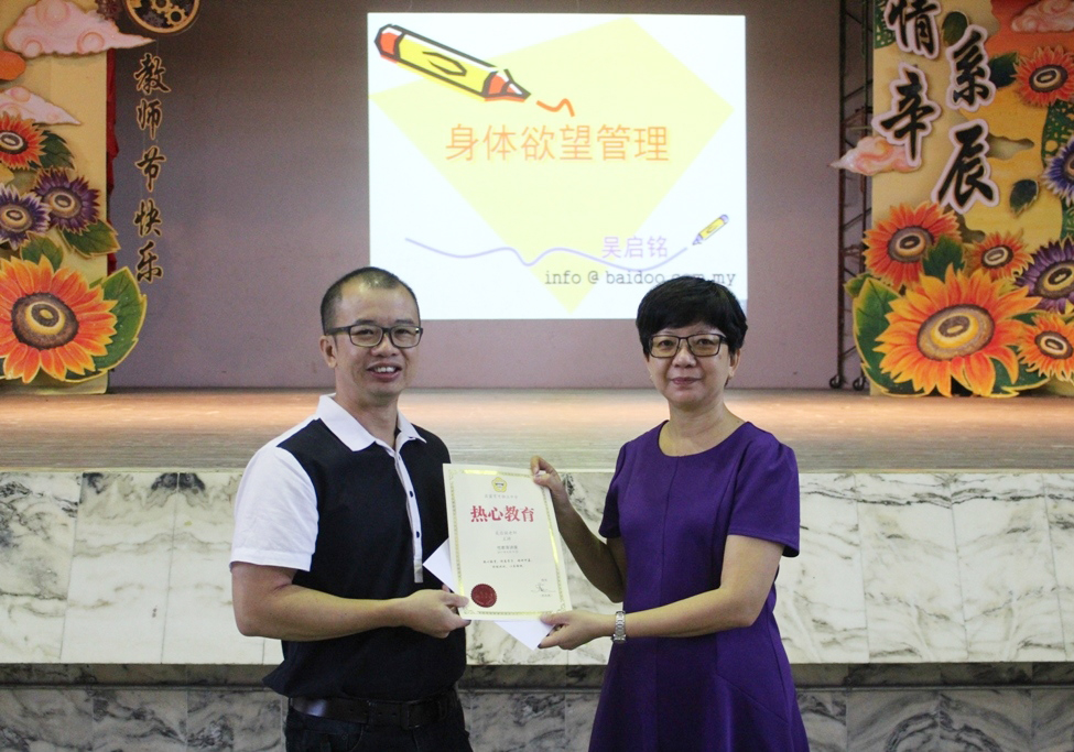 本校副校长兼辅导主任陈美云(右)颁赠纪念奖状给马来西亚性学会(雪隆区)名誉会长吴启铭。