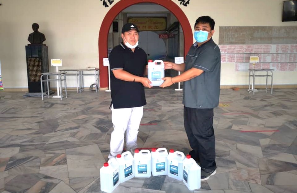 事务处主任锺国华老师(右)代表接领消毒药水。 感谢校友捐赠6600片口罩予本校全体教职员