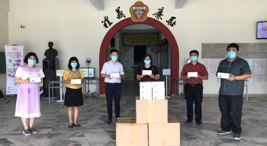 教务处助理李绣秀老师(左起)、教务处主任胡丽珍老师、辅导处主任许环伟老师、宣教处主任蔡雪莉老师、 联课活动处副主任刘誌中老师和事务处主任锺国华老师代表接领由校友们集资捐赠的口罩。 全校复课 — — 疫情防控●人人有责