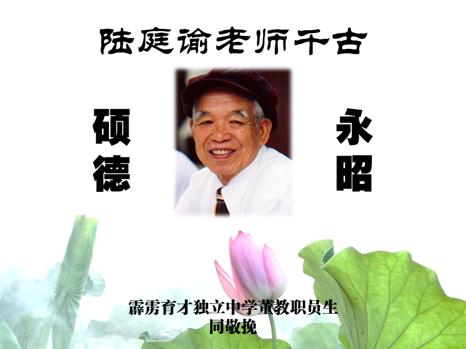华教元老陆庭谕老师日前因病与世长辞,育才独中代表出席陆老师于吉隆坡的丧礼,为陆老师送上最后的敬意。 出席丧礼的代表包括育才独中董事长黄亚珠、署理董事长拿督吴国芳、副董事长覃介邦、董事会总务王瑞国博士、副总务吴景光、财政黄伟生、董事张文义、黎镇光代校长、校长助理刘国荣老师和联课活动处副主任刘誌中老师,以及雪森彭隆霹雳育才校友会代表郑美云。 黄亚珠董事长表示,陆庭谕老师把一生精力都奉献给华教事业,一直站在华教的最前线,为华教奉献的精神值得所有人尊敬。 陆庭谕老师曾经于2013年到育才独中为“独中复兴纪念日”演讲,娓娓道出他在为独中和华文教育争取应有地位时所付出的努力。如今这位华教泰斗撒手人寰,是华教的巨大损失。