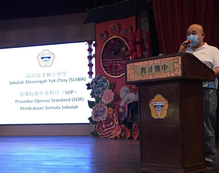 复课前夕,本校全体老师、职员于2020年6月22日在礼堂出席复课汇报会。代校长黎镇光、教务处主任胡丽珍老师和训育处主任王淑媚老师,向全体教职员汇报复课标准作业程序(SOP)。 久别重逢的教职员,大伙儿见面时都欣喜不已。全体教职员也遵守防疫措施,人人戴口罩,保持安全社交距离,领取校方派发的复课标准作业程序手册,进入礼堂仔细聆听汇报。 复课汇报会开始前,全体教职员进行了一分钟的默哀仪式,以真诚的心缅怀本校已故前董事长陈汉水先生和王明华老师。 过几天,即将迎来学校复课后第一个中华传统节日 — — 农历五月初五端午节。因此,教职员联谊会特别派发每位教职员一颗超大的粽子,让教职员在汇报会结束后带回家享用。 文、照片:宣教处 点击以下链接浏览其它照片: https://www.facebook.com/YuCaiDuZhong/posts/3557358697611631 https://www.facebook.com/YuCaiDuZhong/posts/3557561740924660