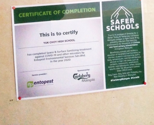 【复课防疫措施】Carlsberg 集团赠送电子温度计及协助消毒 2020年6月19日发布 马来西亚 Carlsberg 集团通过与《南洋商报》、《中国报》及马来西亚全国校长职工会配合的十大义演 “安全校园” 计划,日前派员到本校进行消毒服务,让师生们能够在安全的环境上课。消毒地点包括课室、礼堂、洗手间。此外,Carlsberg 集团也赠送本校 3 支电子温度计,让师生进行温度测量。本校是受益学校之一,非常感谢此次的校园消毒,让师生们安心复课。
