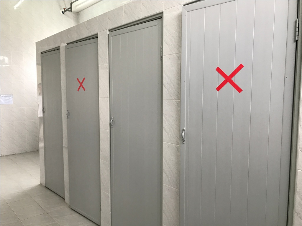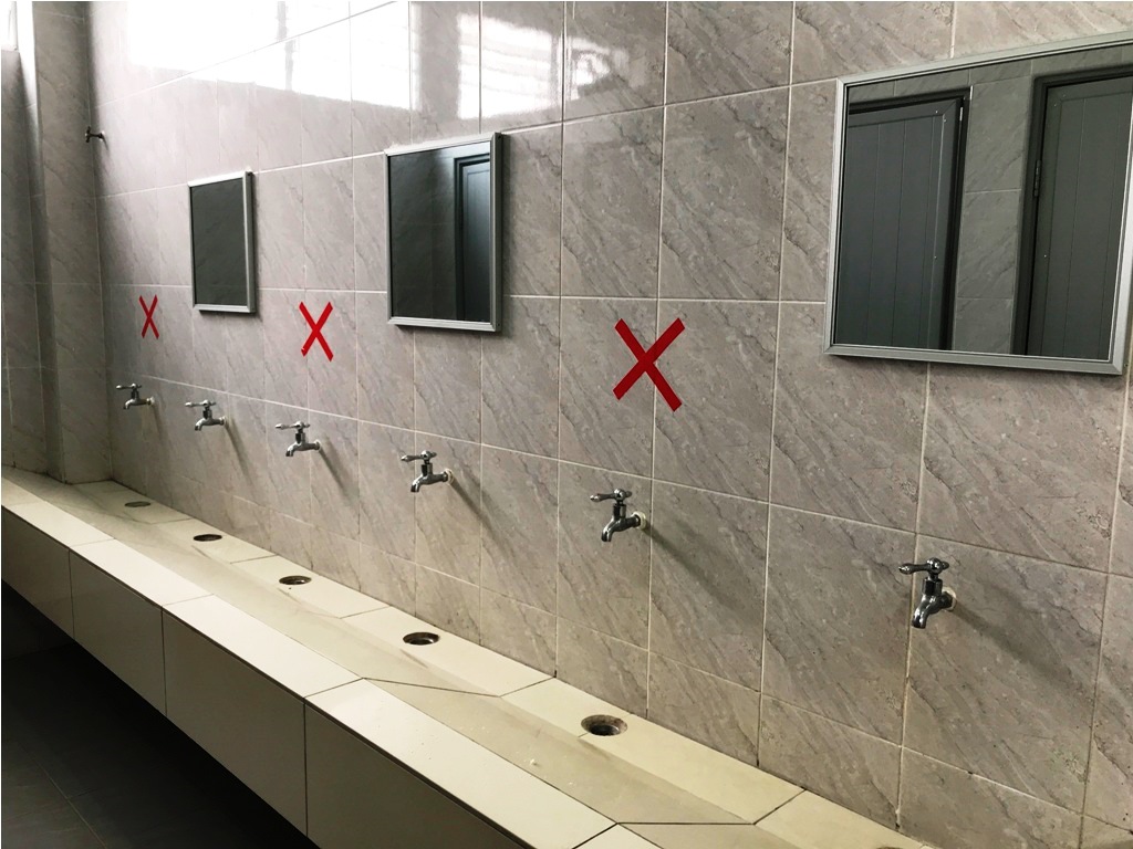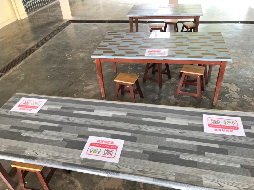 【复课准备】校园公共空间 随着复课的日期越来越接近,本校为学生复课做好一系列的防疫措施,让师生们能够在安心的情况下上课。在校园内的公共区域,都贴上保持安全社交距离的标示,如休息场所、洗手间等;另外在需要排队的地方如贩卖部、收银处的地面上也贴有保持距离的胶带。