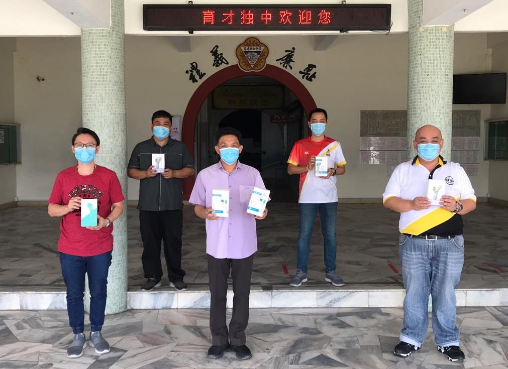 后排左起事务处主任锺国华老师、联课活动处主任朱荣熙老师; 前排左起校长助理刘国荣老师、家教联谊会主席丘耀仁、代校长黎镇光。 育才独中网络教学 — — 王英健老师、锺微丝老师:体育