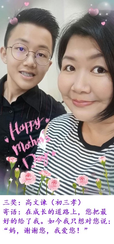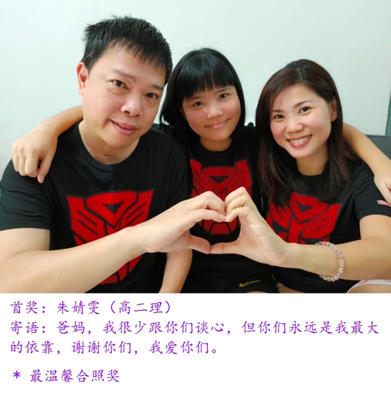 “爸妈,我爱你 • 爱的寄语” 有奖竞赛成绩揭晓啦! 【首奖】:朱婧雯(高二理) 寄语:爸妈,我很少跟你们谈心,但你们永远是我最大的依靠,谢谢你们,我爱你们。 . 【二奖】:曾梓晋(高二商) 寄语:世间烦恼何其多?唯有相思不可少。所有的爱与关怀,凝聚于此,祝母亲节快乐! . 【三奖】:高文谏(初三孝) 寄语:在成长的道路上,您把最好的给了我。如今我只想对您说:“妈,谢谢您,我爱您!” . 【安慰奖】: 陈怡蒨(初二信)、胡仳恩(高一文美)、梁嘉雯(高三理)、梁嘉伟(初二信)、张恩仪(初三信)、区靖仪(高三商1)、潘骏宥(高二文)、李淑伶(初三孝)、刘敏思(高一文)、周洁诗(初二忠) . 【最温馨合照奖】:朱婧雯(高二理) . 首 20 名寄语者也可获得神秘礼物一份。 联课活动处在近期内会发通知到所有获奖学生的个人学校电邮。