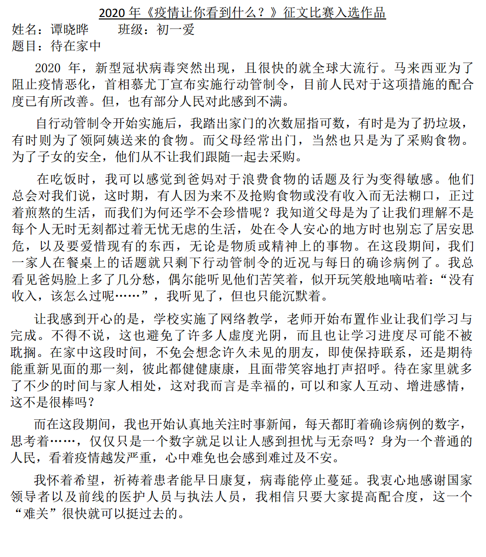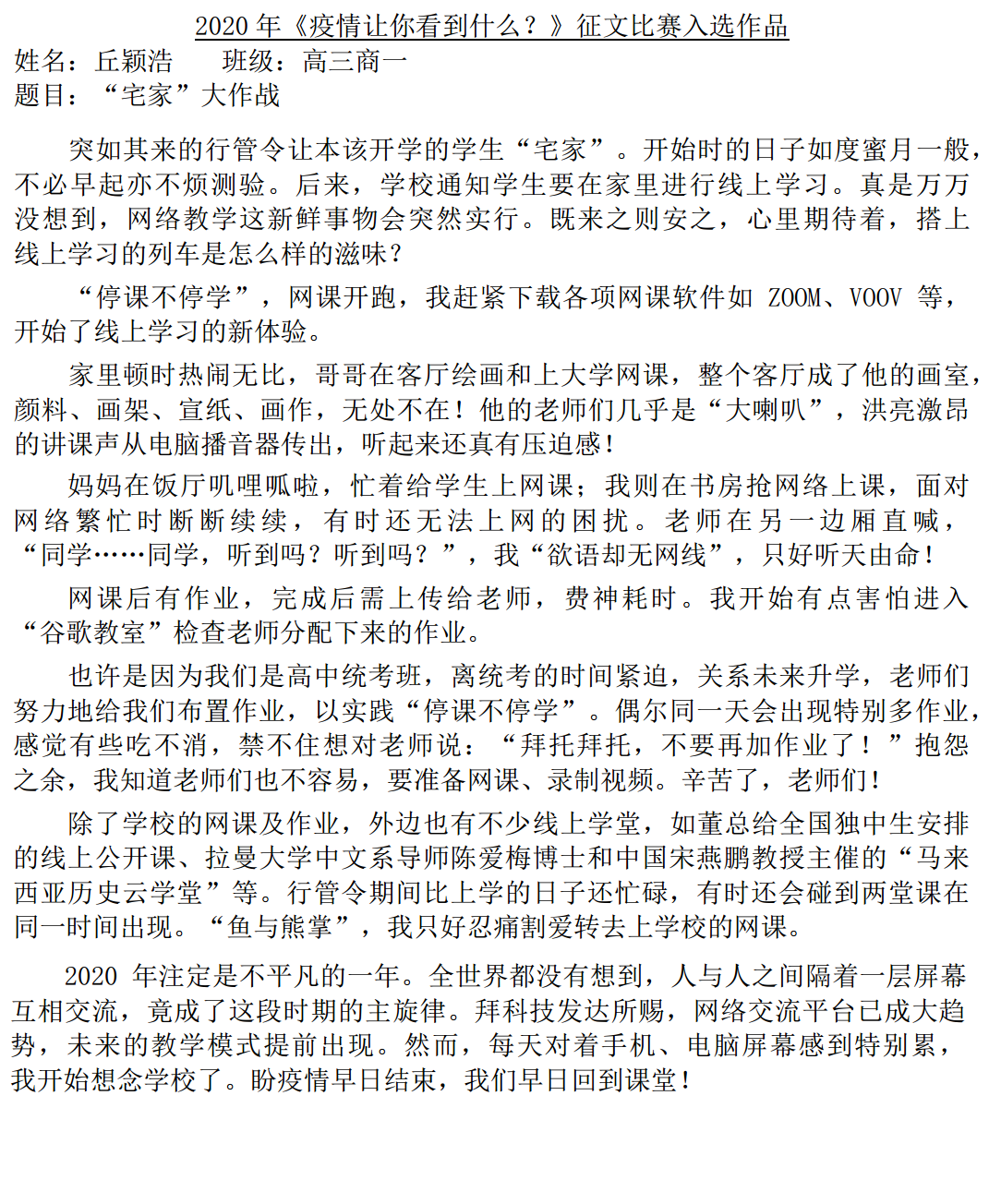 《疫情让你看见什么?》征文比赛入选作品(14,15) 2020年6月3日发布 在漫长的抗疫过程里,本校宣教处举办的《疫情让你看见什么?》征文比赛,获得了同学们热烈的反应,感谢同学们的参与。 今天03/06/2020公布的最后两份入选作品,来自初一爱的蔡谭晓晔同学、高三商一的丘颖浩同学。 » 点击浏览 27/05/2020 公布的作品:来自初一爱的覃星珲同学、高二理的高婕丝同学 » 点击浏览 28/05/2020 公布的作品:来自初二孝的吴泓欣同学、初三孝的杨曲星同学、高一商一的廖雪晶同学 » 点击浏览 29/05/2020 公布的作品:来自初三孝的高文谏同学、高三理的方翊诠同学 » 点击浏览 30/05/2020 公布的作品:来自初一爱的王垲铮同学、高二理的梁咏恬同学 » 点击浏览 01/06/2020 公布的作品:来自高一理的梁宇慷同学、高二商的曾梓晋同学 » 点击浏览 02/06/2020 公布的作品:来自初三爱的蔡翔俊同学、高一文的郑倪颖同学 .入选作品的名单如下: