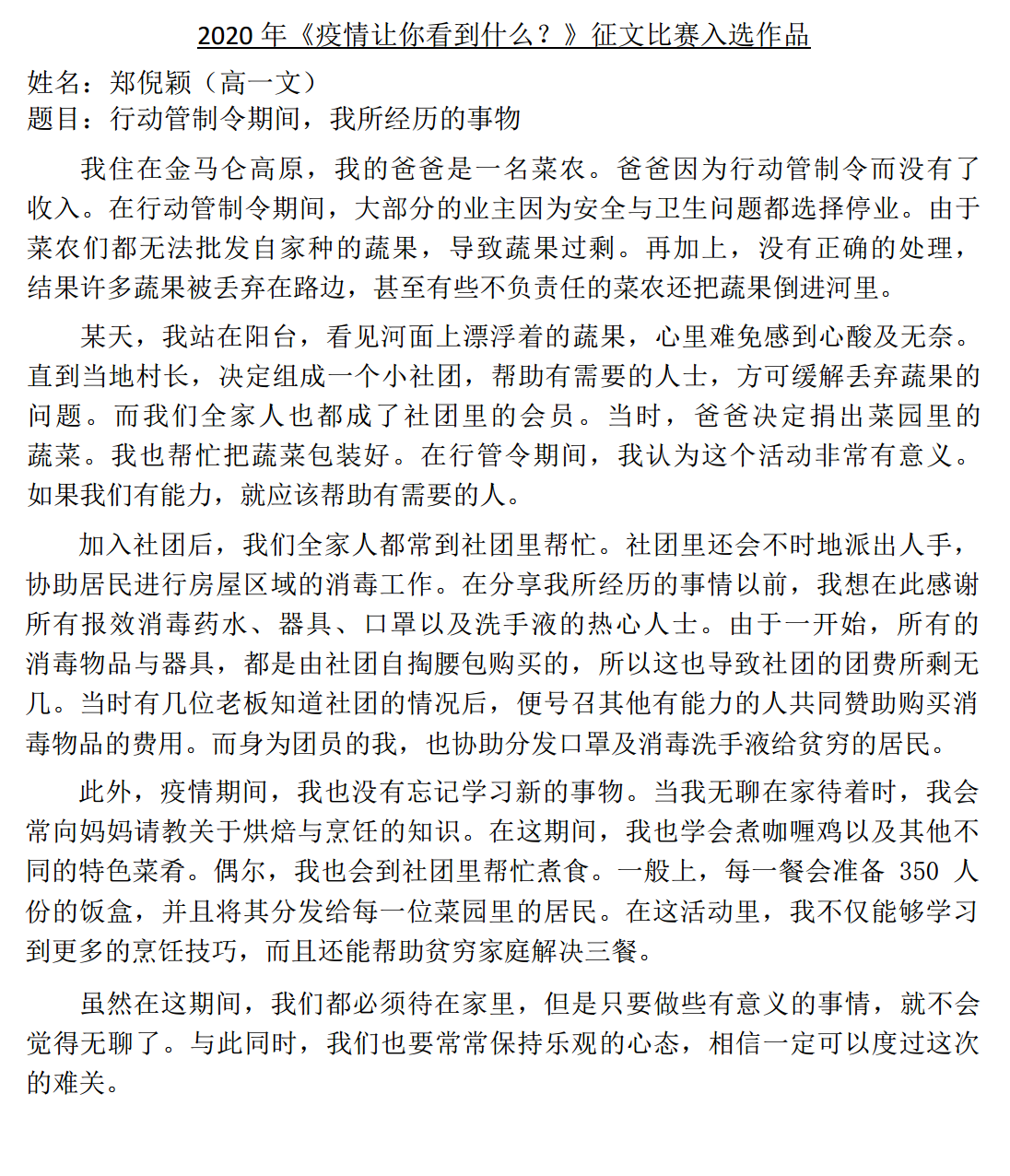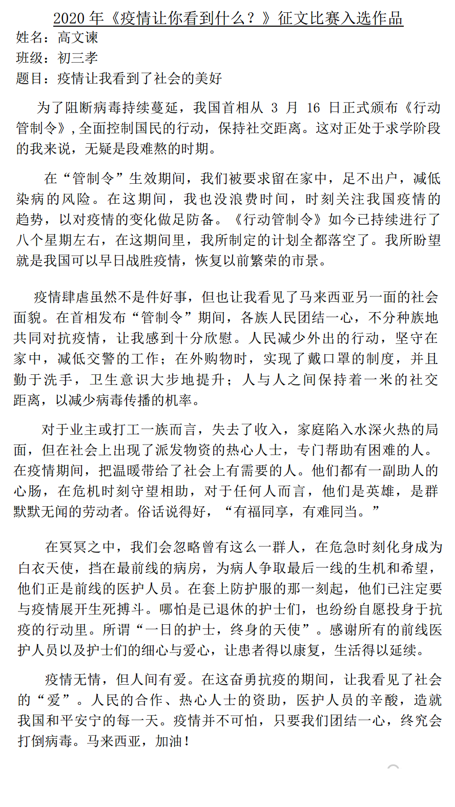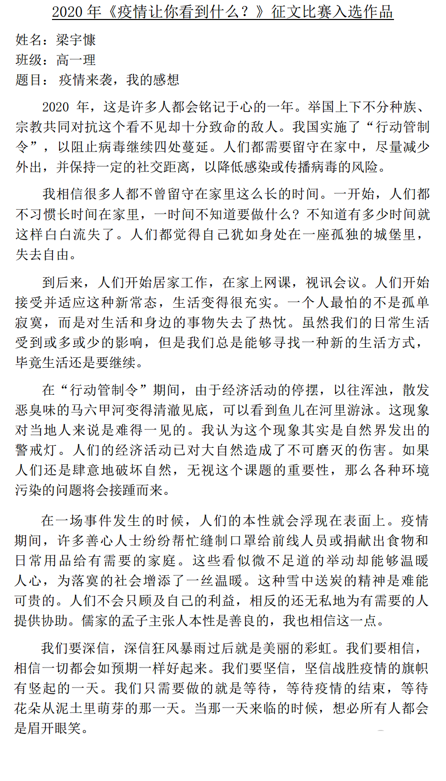 《疫情让你看见什么?》征文比赛入选作品(6,7) 2020年5月29日发布 在漫长的抗疫过程里,本校宣教处举办的《疫情让你看见什么?》征文比赛,获得了同学们热烈的反应,感谢同学们的参与。 【备注:入选作品將于一星期内陆续公布,敬请关注,谢谢。】 今天 29/05/2020 公布的作品,是来自初三孝的高文谏同学、高三理的方翊诠同学。 » 点击浏览 27/05/2020 公布的作品:来自初一爱的覃星珲同学、高二理的高婕丝同学 » 点击浏览 28/05/2020 公布的作品:来自初二孝的吴泓欣同学、初三孝的杨曲星同学、高一商一的廖雪晶同学 .入选作品的名单如下: